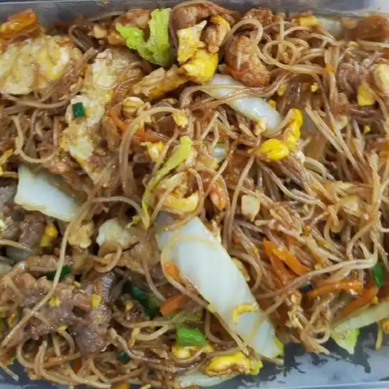 Macarrão de arroz (fininho), carne suína, repolho, cenoura, cebola e ovo