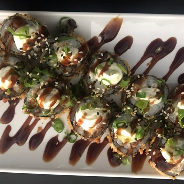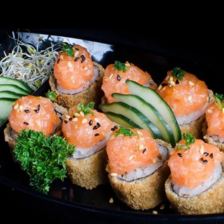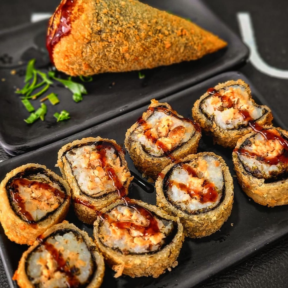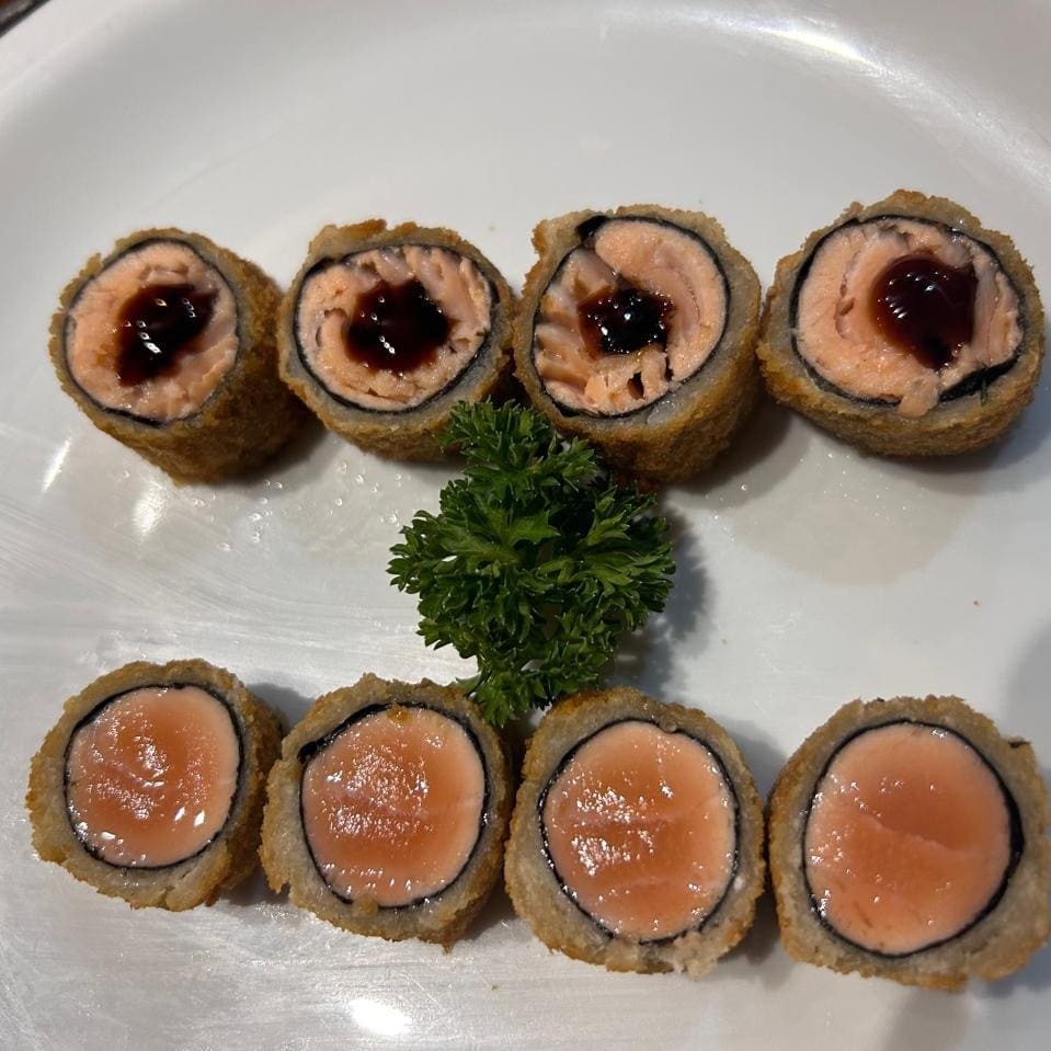 8 peças de Hot Rolls 1 Temaki Hot Todos feitos com salmão grelhado, farinha panko da melhor qualidade, finalizado com molho tarê especial da casa. (Não fazemos alteração nos pratos)