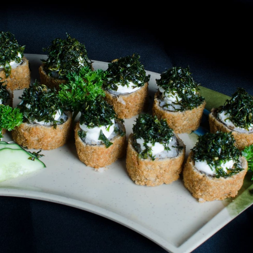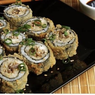Shari, 150 gramas de salmão empanado, ,couve frita, cebolinha e cream cheese.