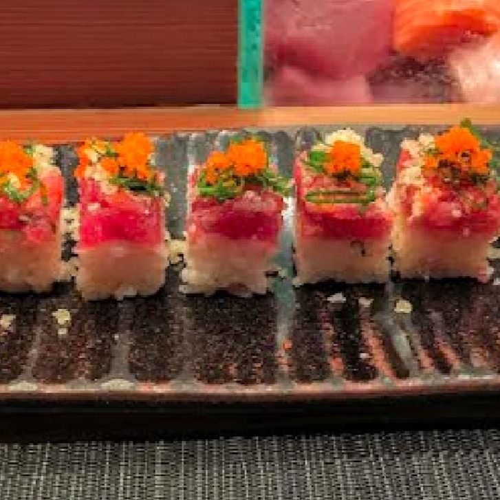 Bolinho de arroz com fatia de atum maçaricado por cima.