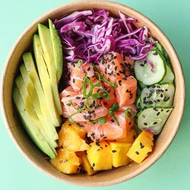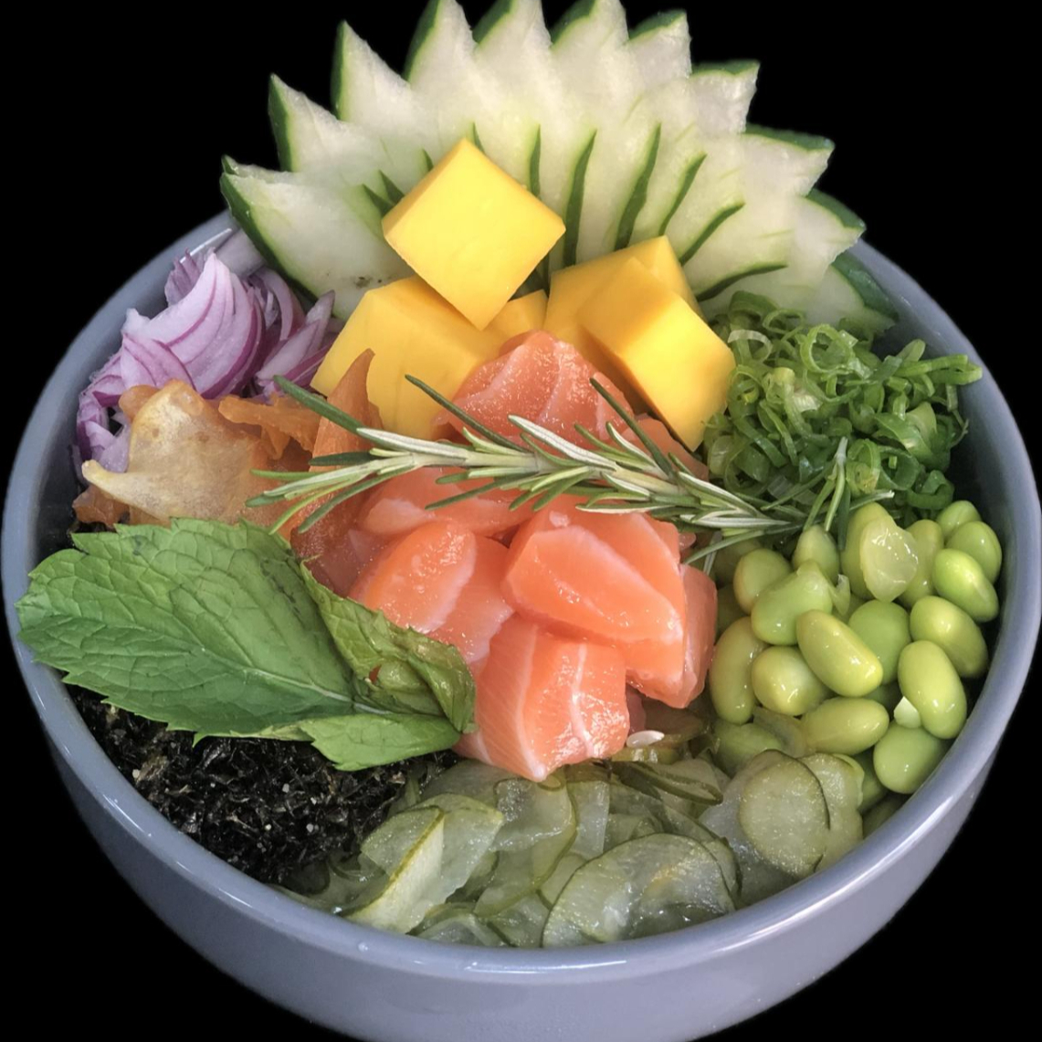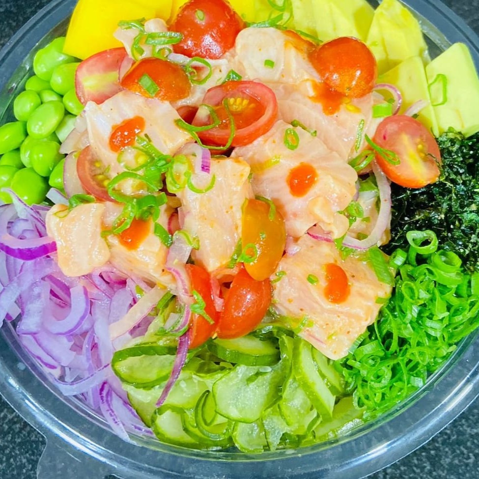 Poke com 10 ingredientes fresquinhos : Shari,salmão,manga,abacate,cenoura,repolho,tomate cereja,cebola roxa,pepino e moyashi.