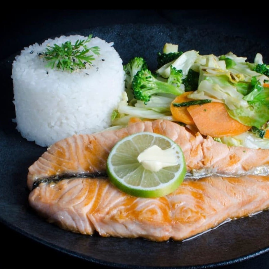 Salmão grelhado, legumes na manteiga , acompanha gohan.