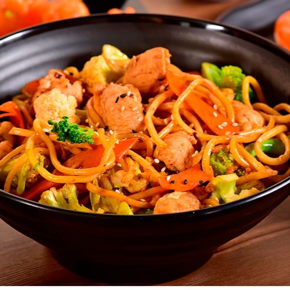 Escolha a proteína + Base de arroz, moyashi, cebola roxa, tomate cereja, manga, chips de batata, cebolinha.