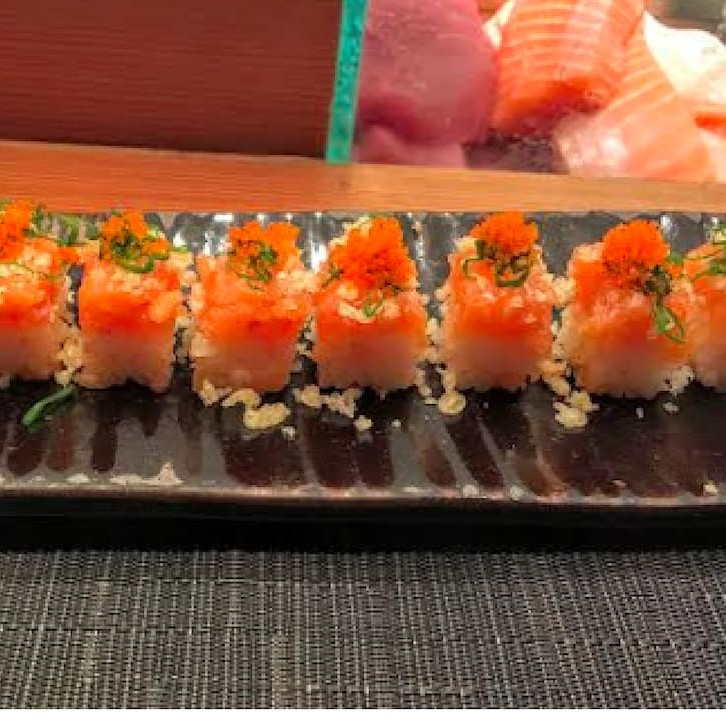 Bolinho de arroz com fatia de salmão maçaricado por cima.