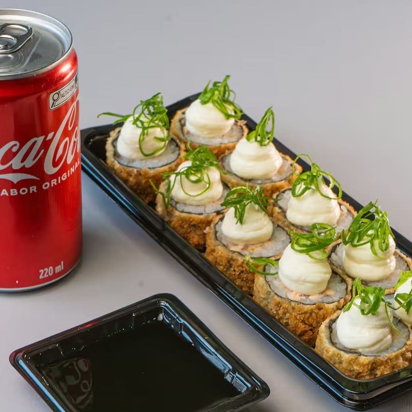 8 deliciosos Hot Rolls fritos na farinha Panko da mais alta qualidade + Temaki Hot de Salmão Grelhado com delicioso Cream Cheese Danúbio e para acompanhar, aquela Coca-Cola Zero lata trincando. Match perfeito! (Não fazemos alteração nos pratos)
