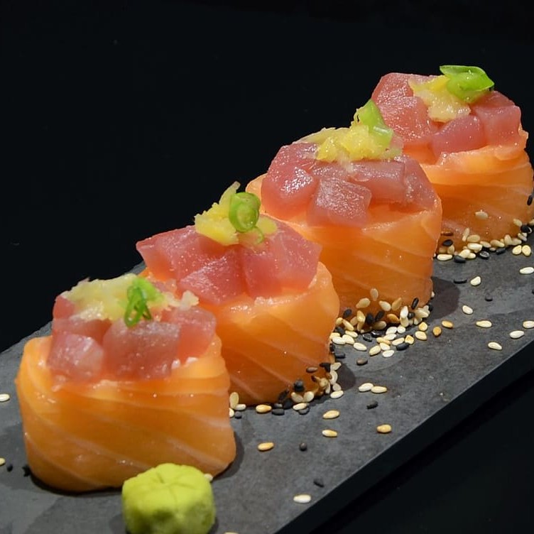 Anéis de salmão com atum e cebolinha.