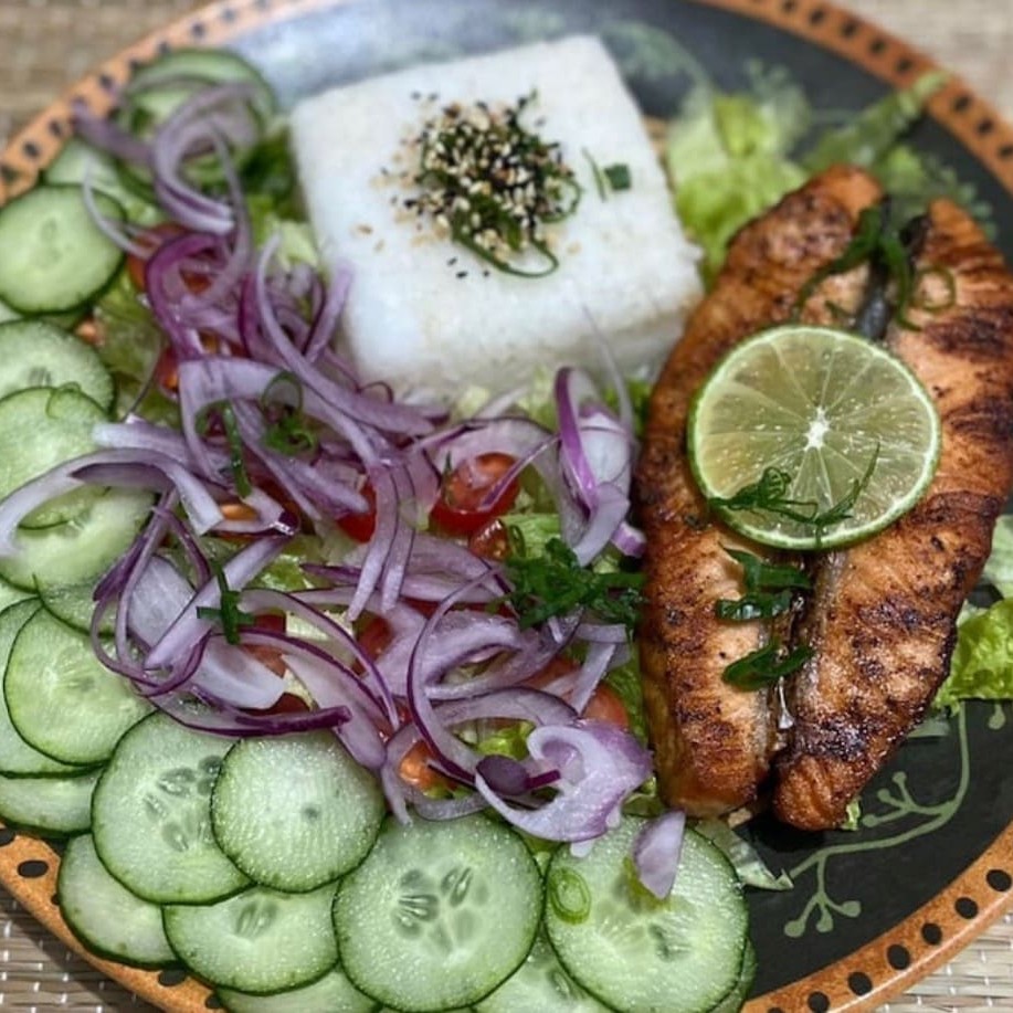 Salmão grelhado,salada(alface,tomate cereja,cebola roxa e pepino)acompanha gohan