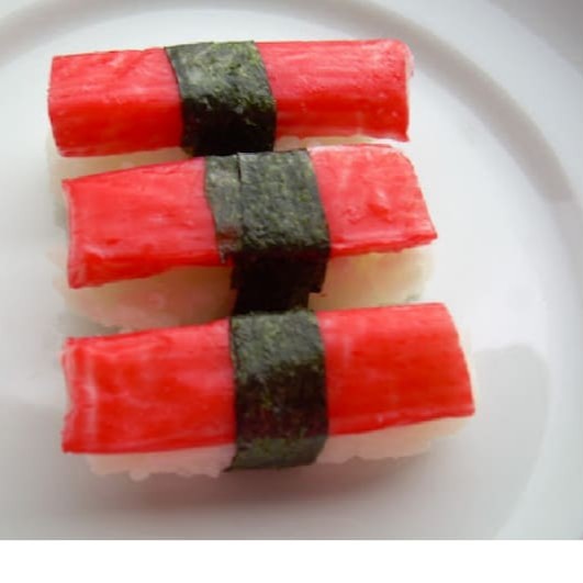 Bolinho de arroz com fatia de kani por cima.