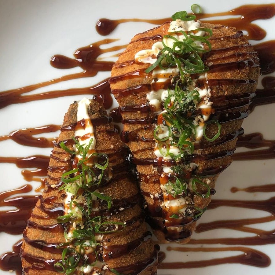 Salmão completo com cream cheese, empanado na farinha panko e frito, finalizado com cebolinha e gergilim