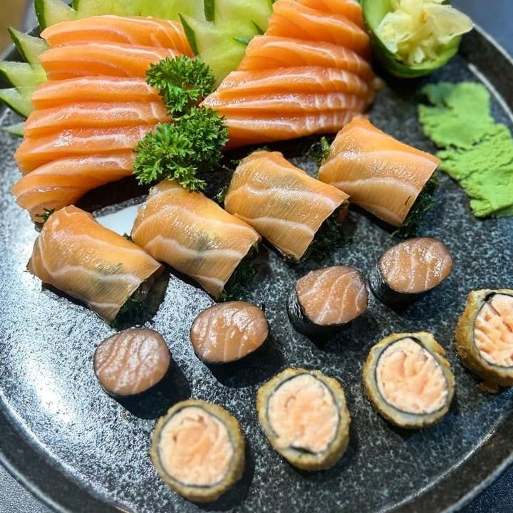 12 sashimi de salmão 4 king couve 4 hossomaki de salmão sem arroz 4 hot de salmão sem arroz