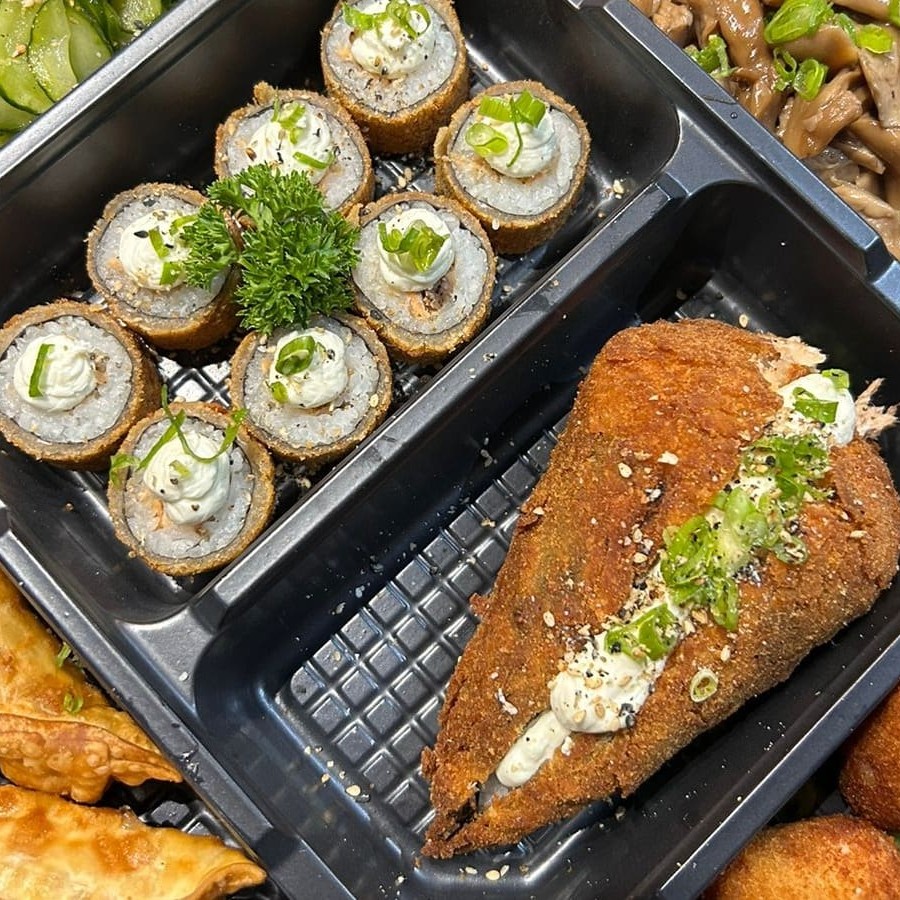 1 temaki empanado e frito 2 guiozas 70 gramas de shimeji 55 gramas sunomono 8 unidades hot holl 2 croquete de salmão