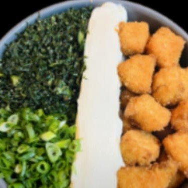 Salmão em cubos, edamame, cebola roxa, sunomono, mix gergelim, couve crispy e cebolinha.