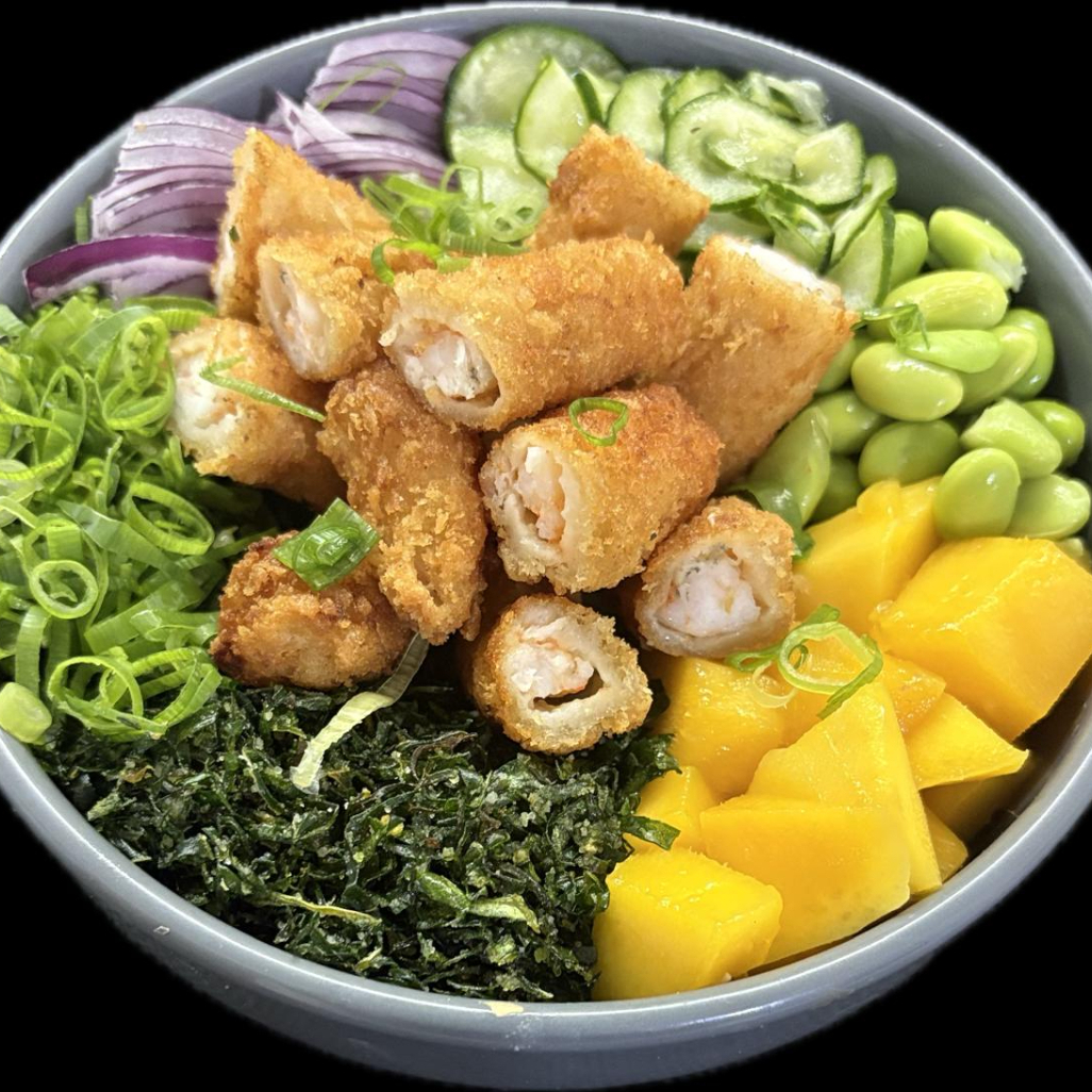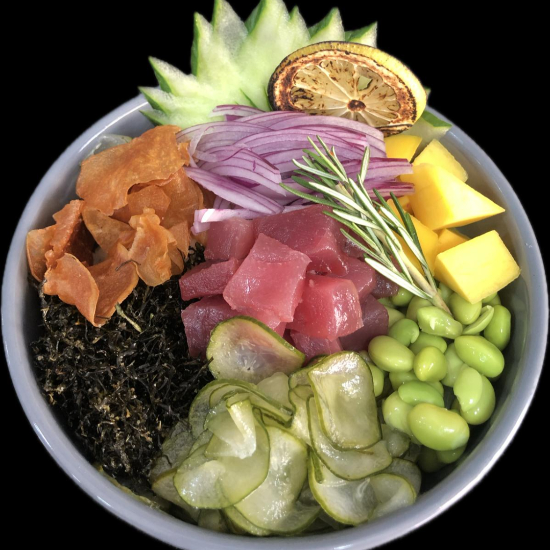 Shari, 150 gramas de atum, edamame, sunomono, cebola roxa, couve frita, gergelim e cebolinha, manga ou abacate.