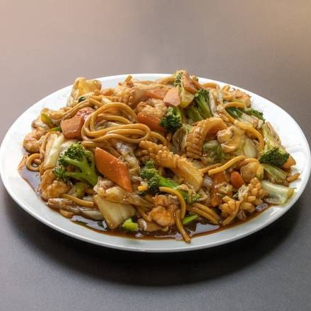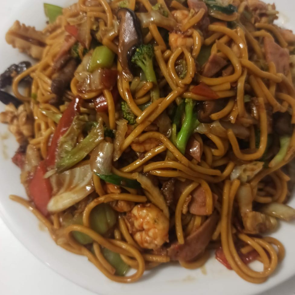 Macarrão com pedaços selecionado de camarão, lula, carne, frango, legumes e champignon