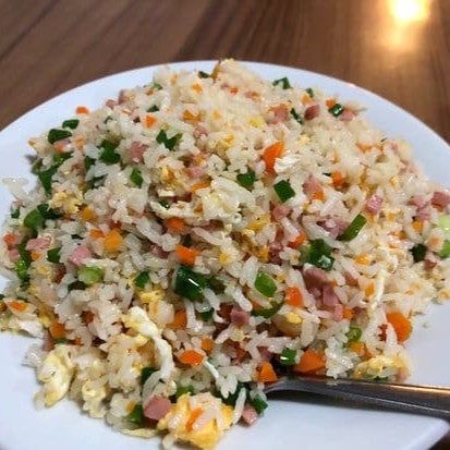 Arroz com ovos, cenoura, presunto e cebolinha picada