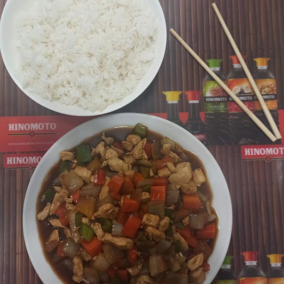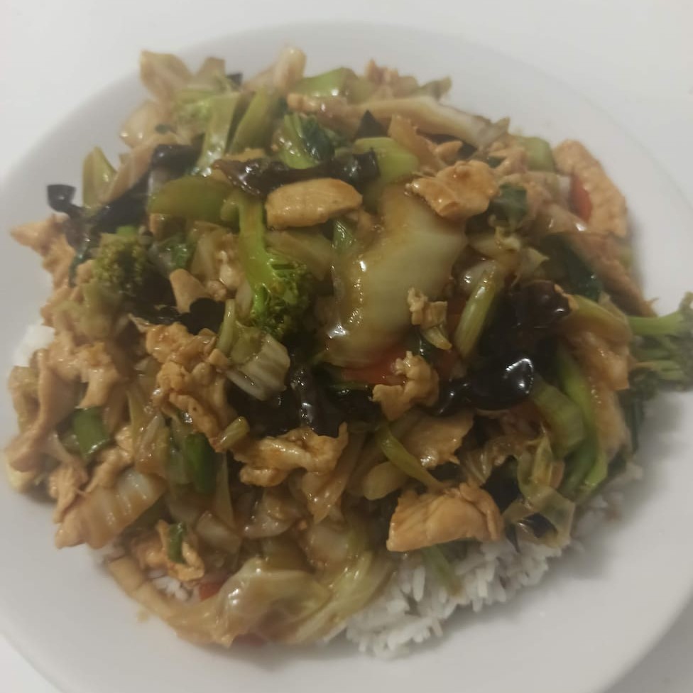 Arroz ( gohan) com legumes, peito de frango e funghi