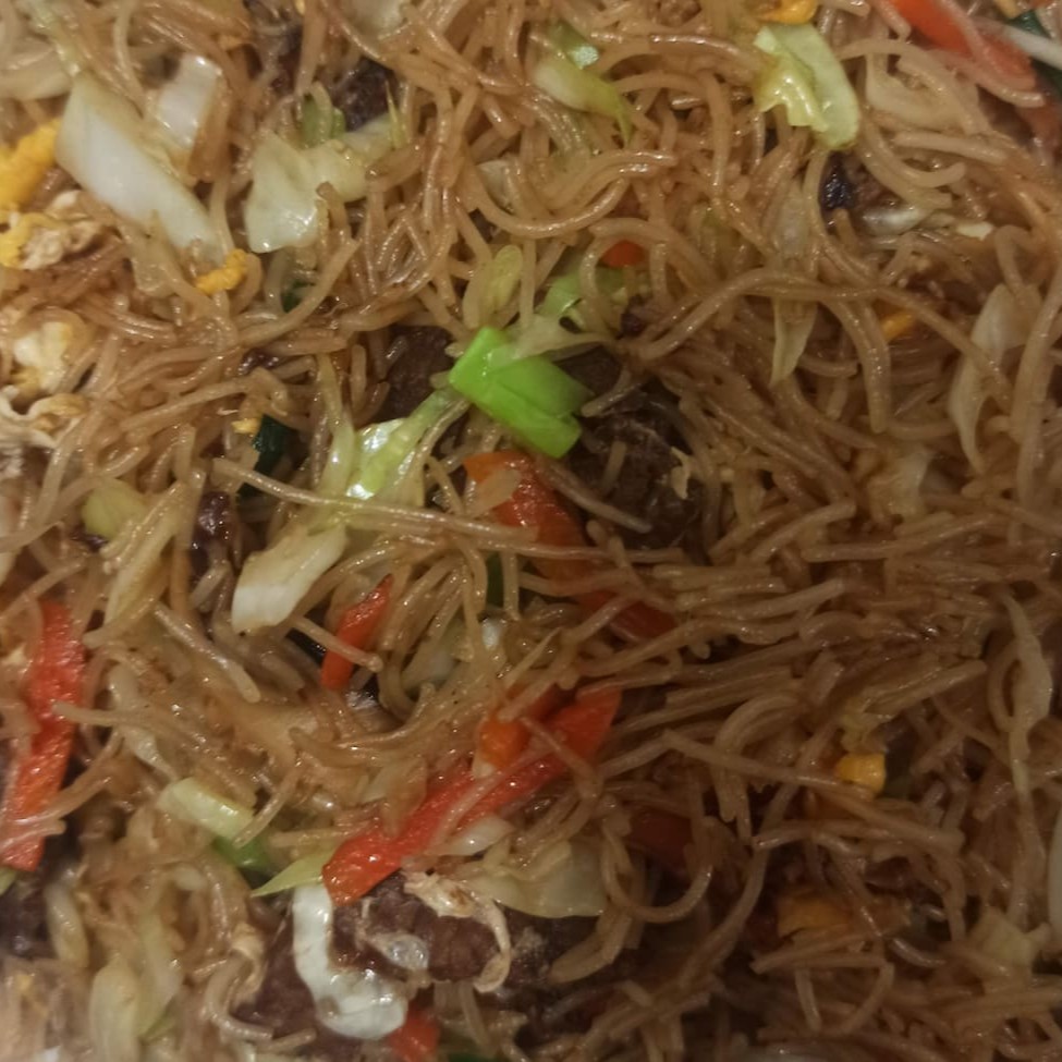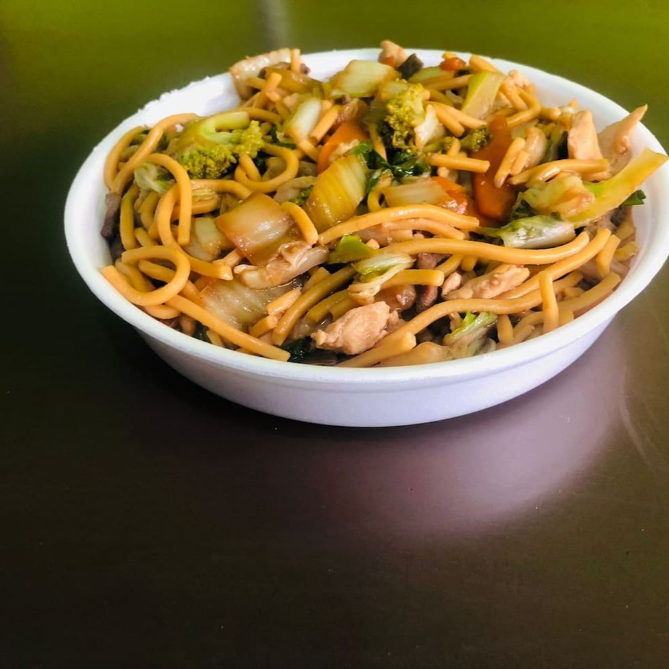 Macarrão de arroz, broto de feijão ( moyashi) nira, cenoura, ovo,cebolinha, repolho e cogumelo chinês em tiras