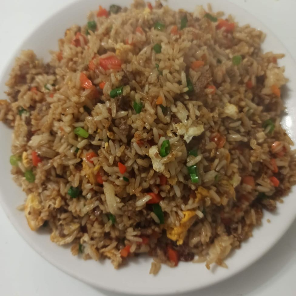 Arroz, ovos, cenoura, carne bovina e cebolinha