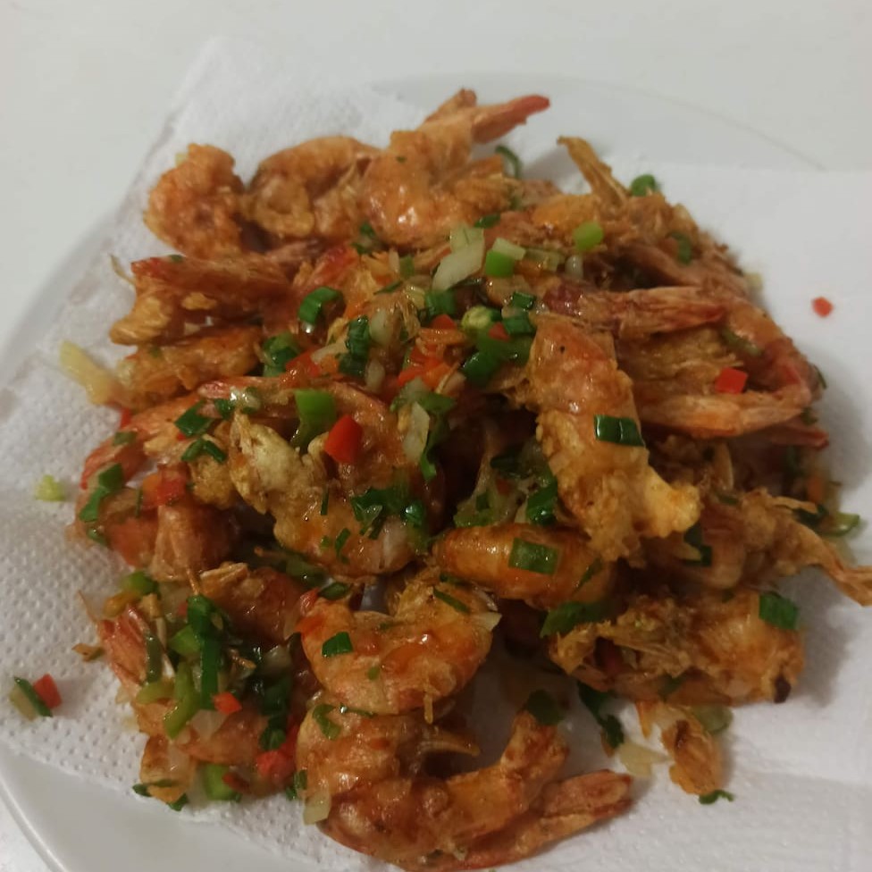 Camarão com casaca temperado e frito decorado com pimentão verde e vermelho