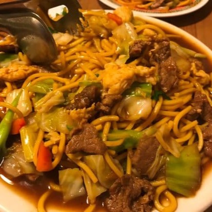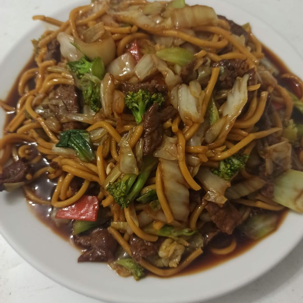 Macarrão com pedaços de carne bovina e legumes ao molho especial