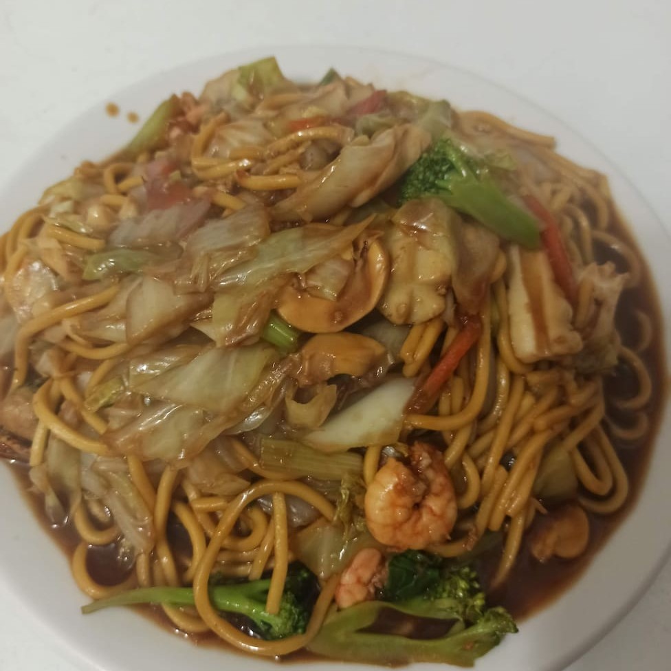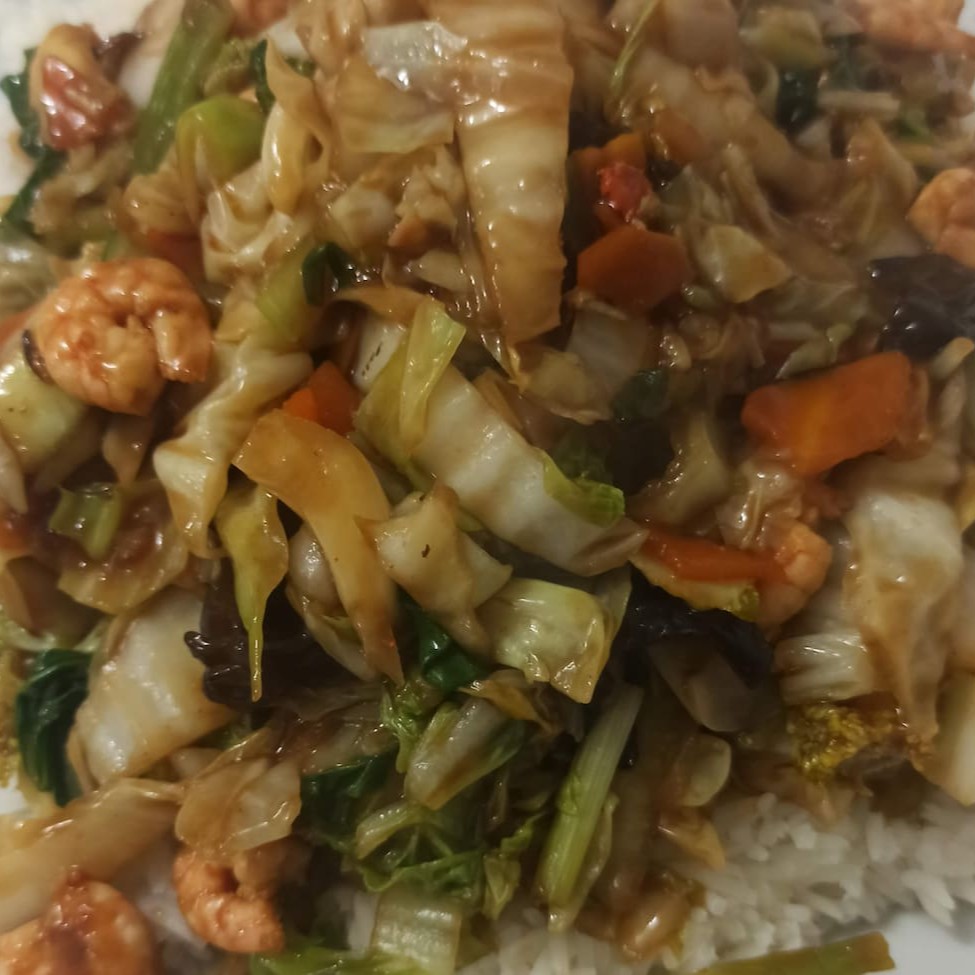 Macarrão de arroz, camarão, lula, cenoura, repolho, cebolinha e champignon em tiras