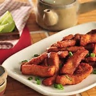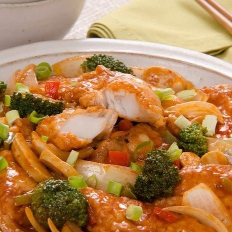 Cubos de lombo empanados ao molho agridoce com abacaxi, cebola e pimentão.