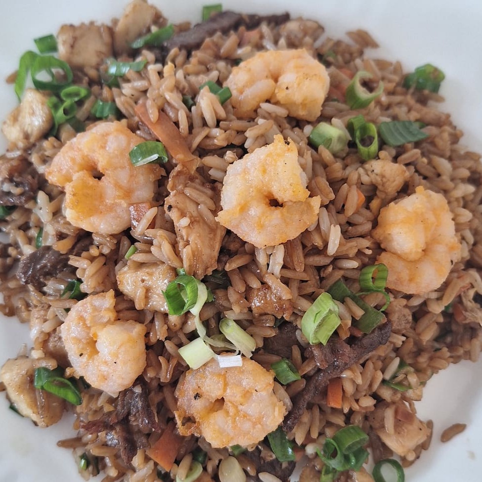 Tradicional arroz chines ,carne,frango,camarão,ovos,cenoura , cebolinha picada e molho de soja.