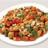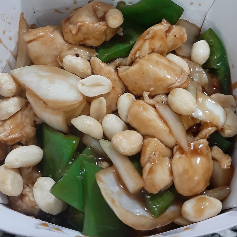 Cubos de peito de frango com cebola, pimentão e amendoim .