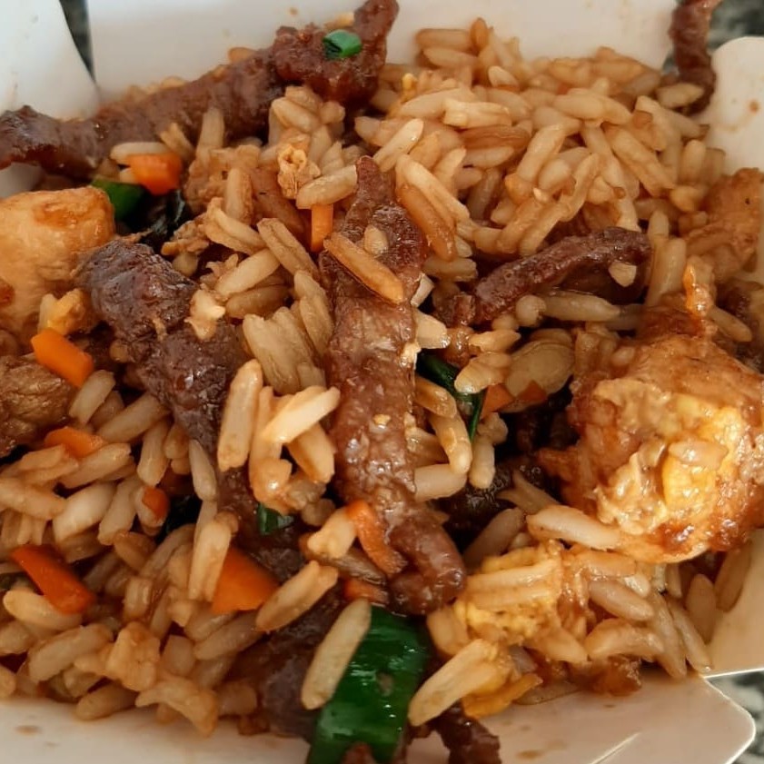 Arroz frito com filé bovino em tiras, cubos de peito de frango, ovo, cenoura cebolinha picada e molho de soja.