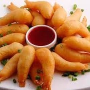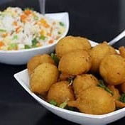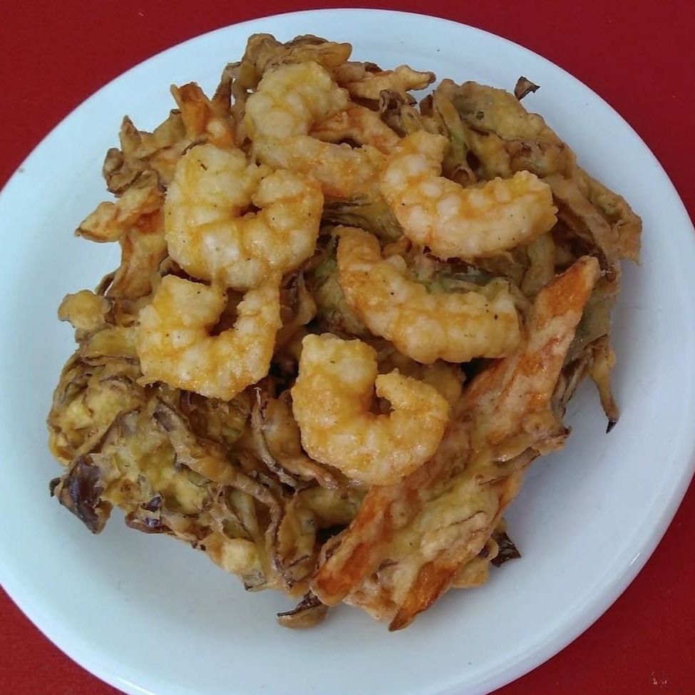 Bolinho de legumes frito e recoberto com camarão e acompanha molhinho agridoce.