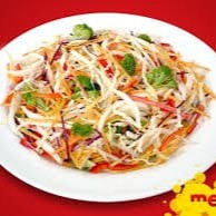 Delicado macarrão de arroz, carne desfiada, cenoura, pimentão, repolho, cebola e broto de feijão.