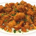 Pedaços de frango desossados e fritos salpicados com alho e cebolinha.