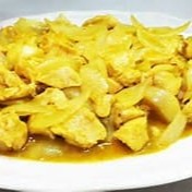 Cubos de peito de frango com cebola ao curry, levemente picante.