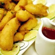 Pedaços de filé de coxas, levemente empanados acompanha molho de soja e gengibre levemente picante