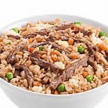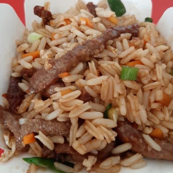 Arroz, com carne bovina, ovos mexidos, cenoura, cebolinha, temperado ao molho de shoyu.