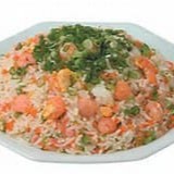 Arroz frito com camarões, ovo, cenoura e cebolinha picada.