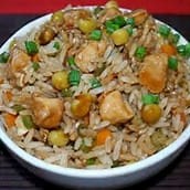 Arroz frito com cubos de peito frango, ovo, cenoura, cebolinha picada .