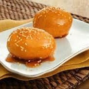 Pedaços graúdo de maçã, empanados e caramelizados e salpicados com semente de gergelim.