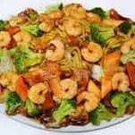 Camarões selecionados com legumes diversos ao molho de soja.