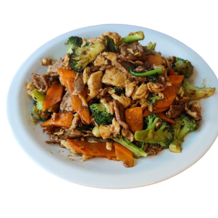 Um prato irresistível "família feliz". Ele acompanha uma carne bem temperada, frango, brócolis e cenoura.