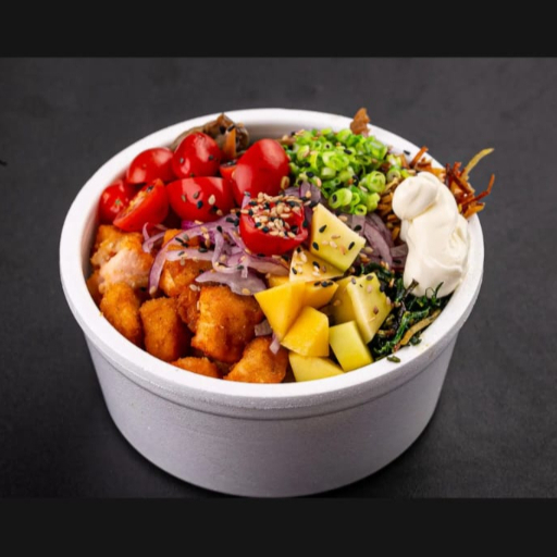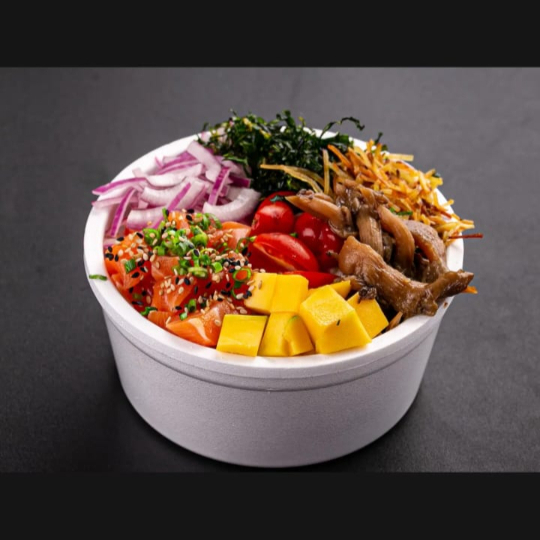Shari (arroz japones), salmão em cubos, shimeji, manga, morango, tomate cereja, cebola roxa, batata crispy , couve crispy, alho poro ,cebolinha, cream cheese e gergilim . Não alteramos itens, caso queira retiramos algum item, somente.