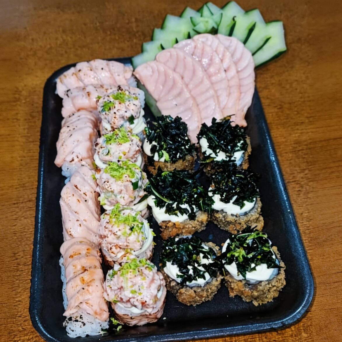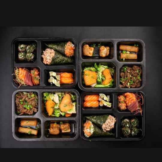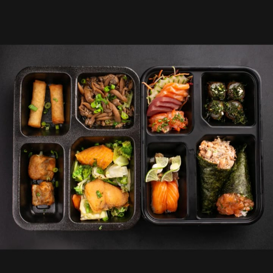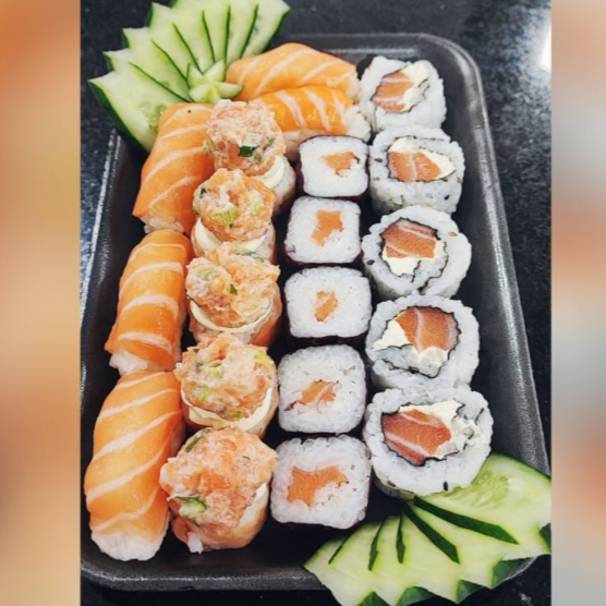 6 Sashimi 2 Jhous 2 niguiri skin 2 Niguiri salmão 4 Hot Hol 2 Temaki 100g a escolha do cliente 2 Guioza 2 Harumaki De Queijo 2 Salmões Grelhados com legumes 1 Shimeji 100g