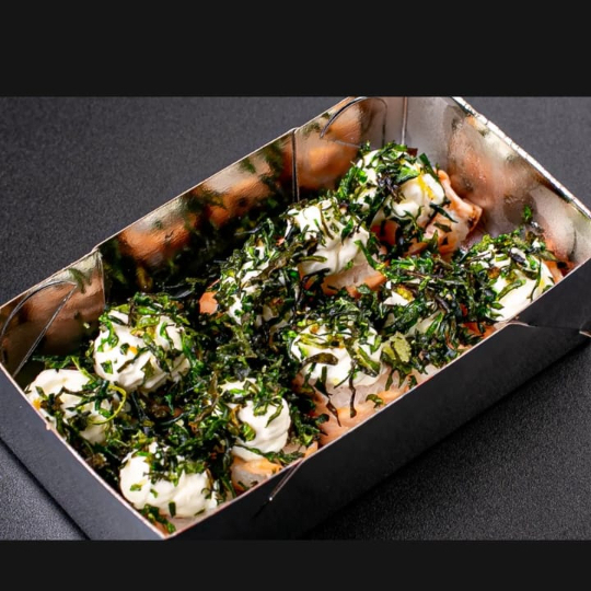 Este prato de '10 Jhou Salmão Maçaricado com Couve Crispy' é uma verdadeira obra-prima da culinária japonesa. Feito com pedaços generosos de salmão fresco e suculento, maçaricado à perfeição para realçar o seu sabor rico e profundo. Acompanha cream cheese cremoso e suave, acrescentando uma textura única e equilibrando a riqueza do peixe. O arroz shari, cozido na perfeição e delicadamente temperado, serve como base perfeita para este prato. Finalizado com toques de couve crispy, adicionando um contraste crocante ao prato. Cada mordida deste elegante uramaki e hossomaki é uma explosão de sabores inesquecíveis.