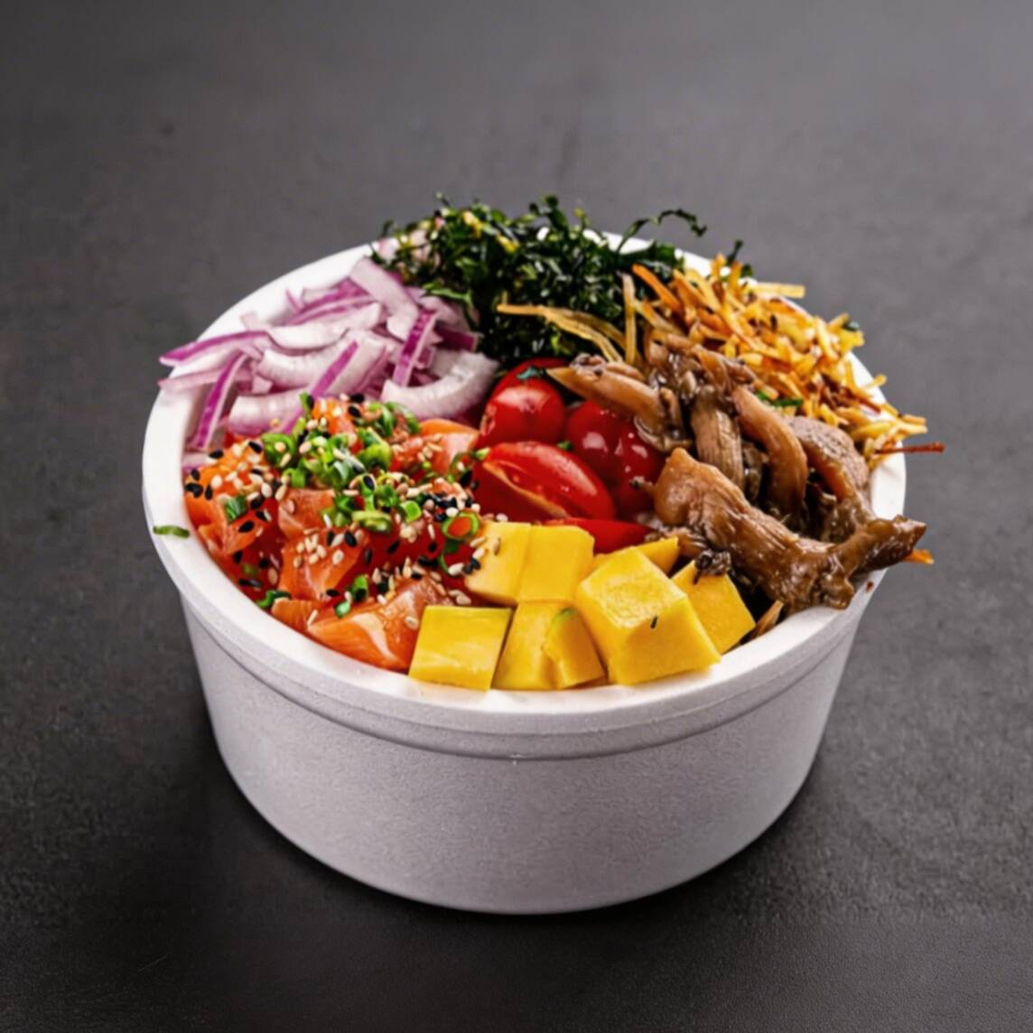 Shari (arroz japones), salmão grelhado, shimeji, manga, morango, tomate cereja, cebola roxa, batata crispy , couve crispy, alho poro ,cebolinha, cream cheese e gergilim . Não alteramos itens, caso queira retiramos algum item, somente.