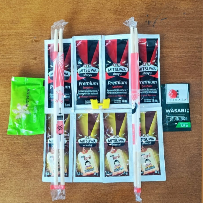 4 tarê 4 shoyu 2 hashi 1 Gengibre 1 wasabi 1 adptado 1 molho agridoce