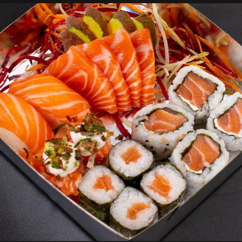 Combo composto por 5 Niguiri de salmão 5 salmonmaki 5 Jhon de salmão 5 uramaki de salmão itens não alterável