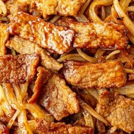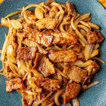 1/2 PORÇÃO PEQUENA DE CARNE BOVINA COM TIRAS DE CEBOLA.