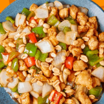 1/2 PORÇÃO PEQUENA DE FRANGO EM CUBOS COM PIMENTÕES, CEBOLA E AMENDOIM.