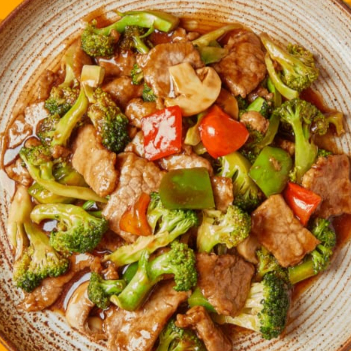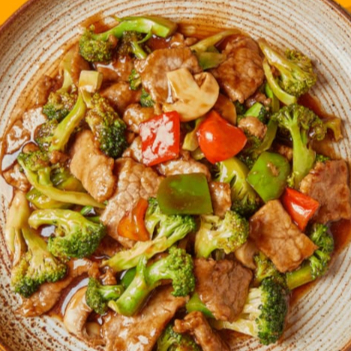 CARNE BOVINA COM BRÓCOLIS, PIMENTÕES E COGUMELOS.