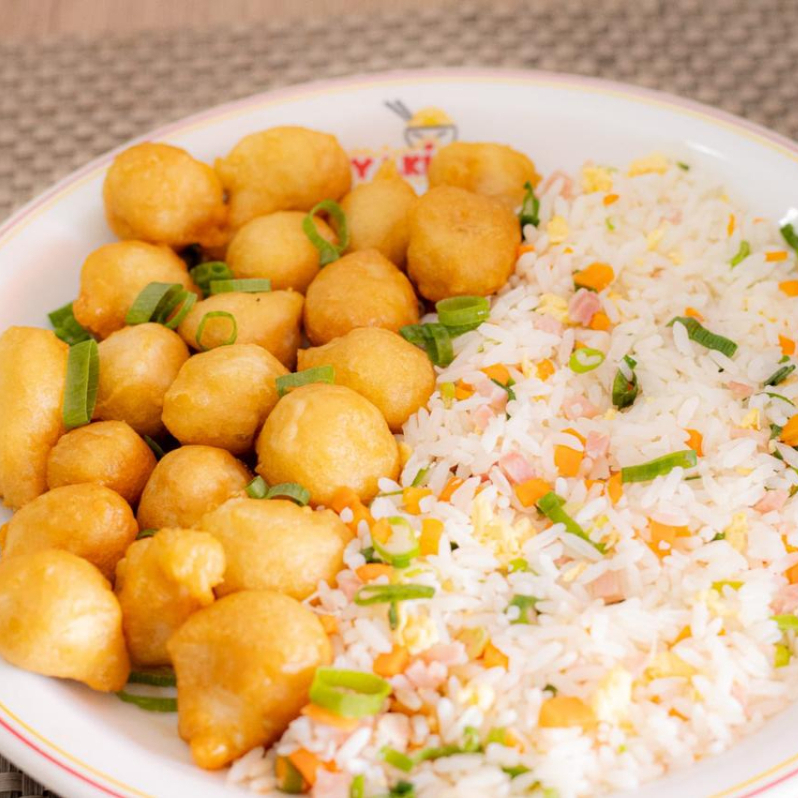 PEQUENA DE ARROZ CHOP SUEY. 1/2 PORÇÃO PEQUENA DE FRANGO EMPANADO AO MOLHO AGRIDOCE COM CEBOLA, PIMENTÃO E ABACAXI.